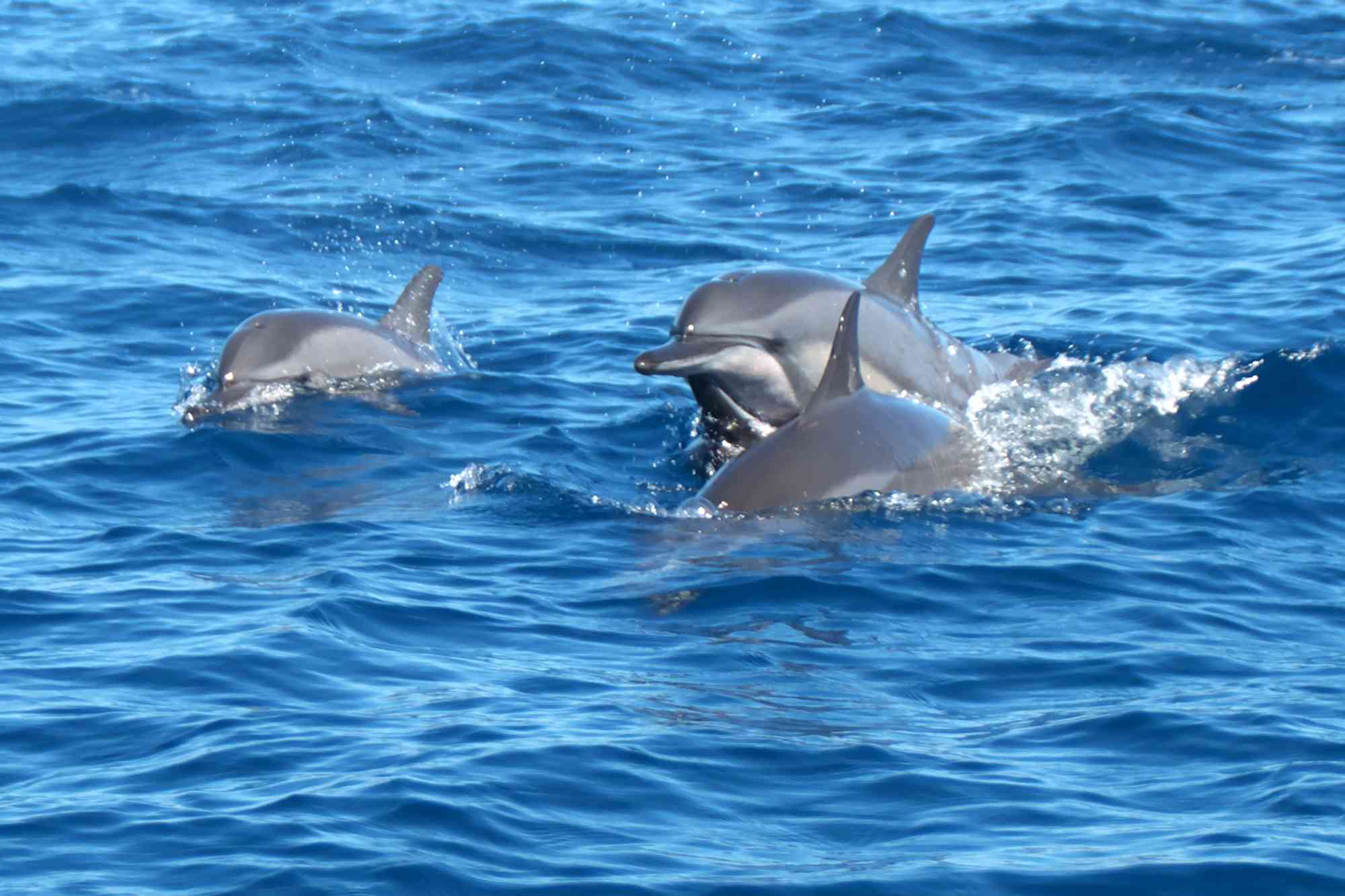 A 8h30: Briefing et départ pour l’observation des Baleines à Bosse. Cependant, la matinée est consacrée à la recherche et à l’observation des baleines à bosse et des dauphins. Pourtant c’est l’occasion d’assister à un spectacle extraordinaire : Couple mère/baleineau se reposant en surface, frappes de caudale et pectorales et souvent des sauts spectaculaires !
